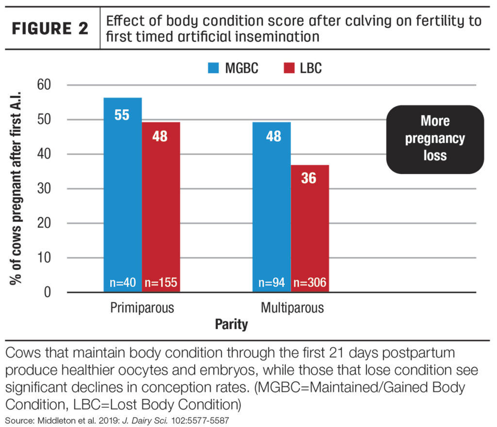 Cows that lose too much body condition in the first 21 days after calving take longer to cycle, have lower-quality eggs and have poorer conception rates. Cows that keep intakes up, maintain condition and avoid deep negative energy balance bounce back faster and give embryos a better chance to thrive (Figure 2).